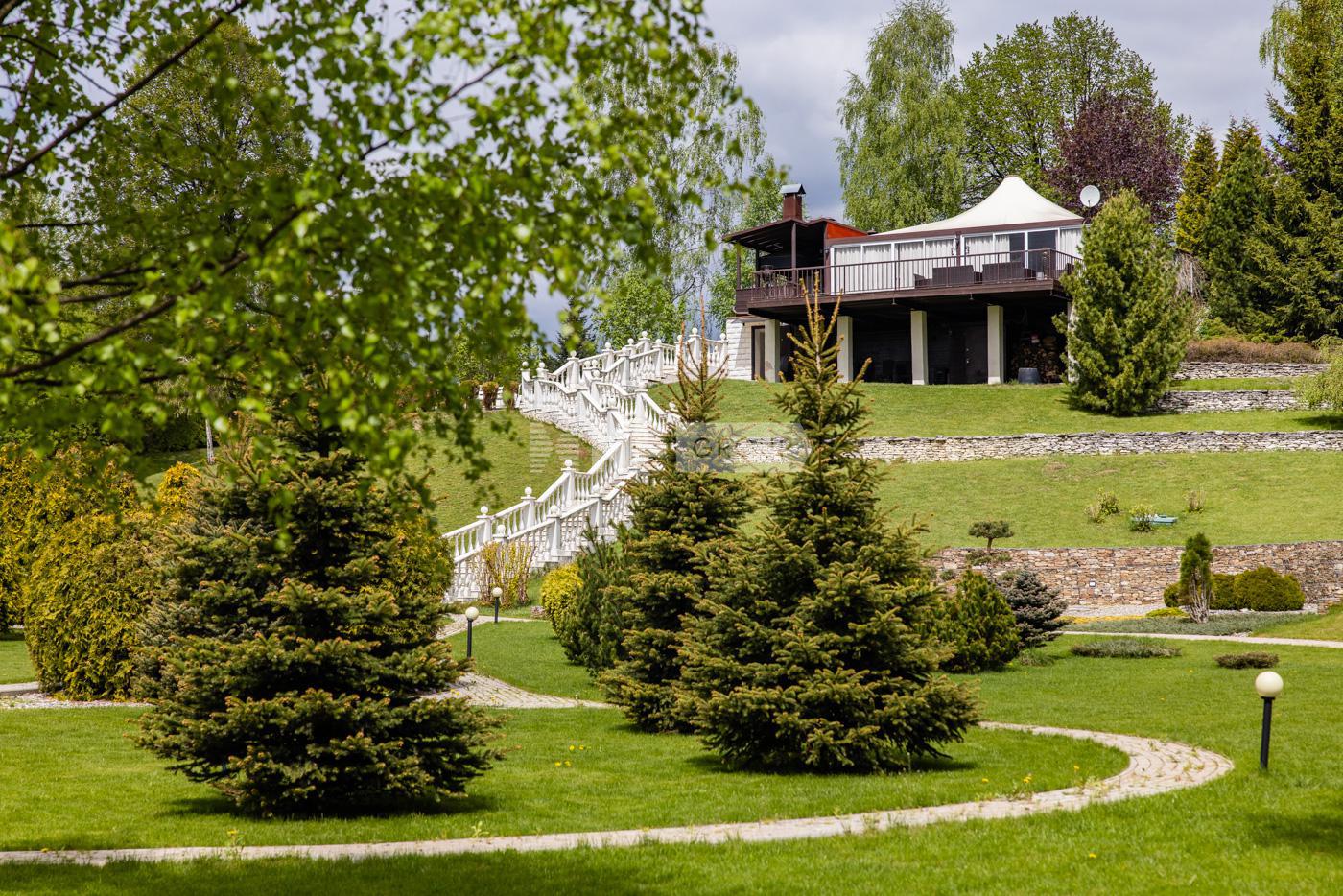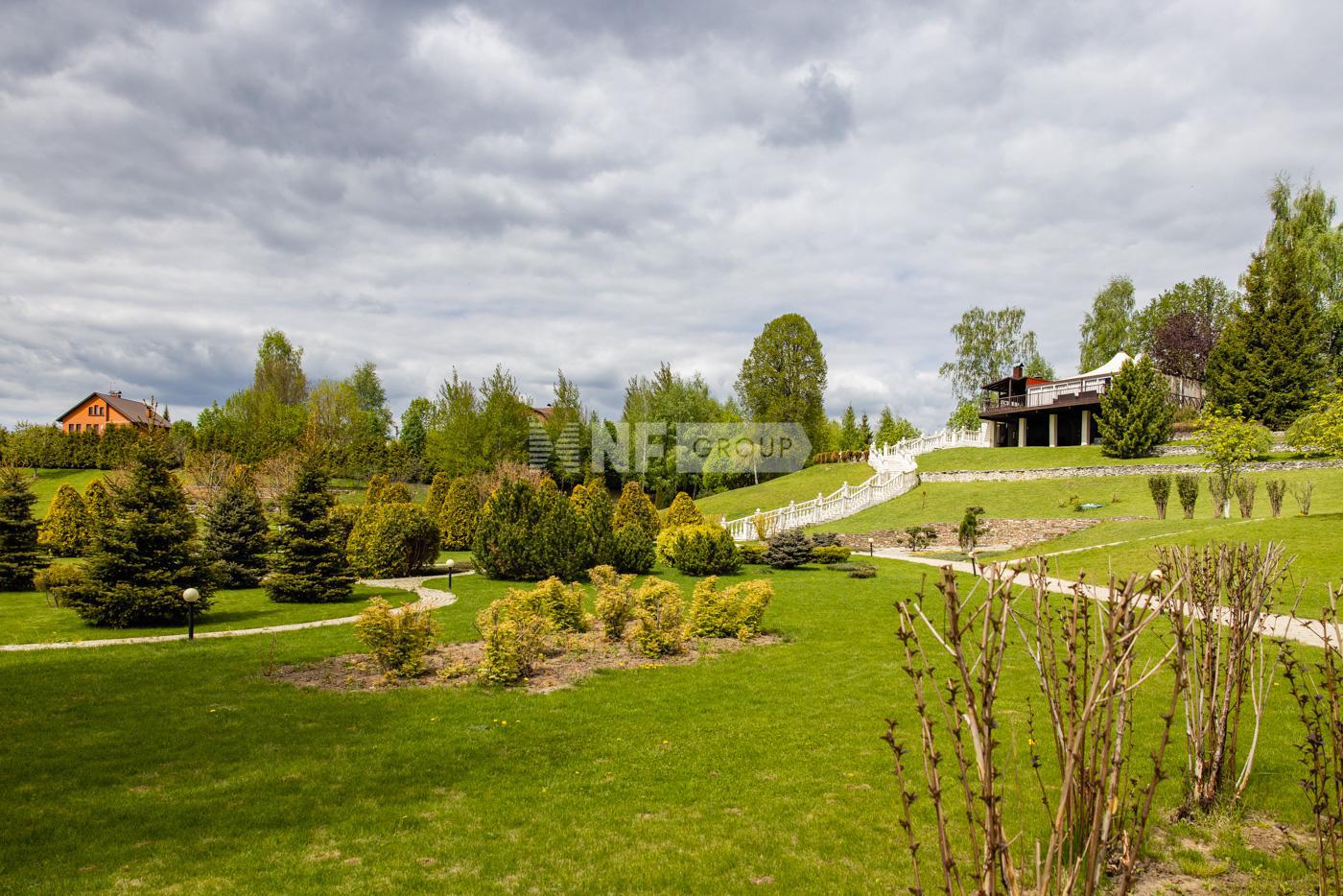 На участке расположен большой дом для персонала 230 м2, ангар для автомобилей 247 м2 и барбекю зона с видовой террасой, площадка для детей.