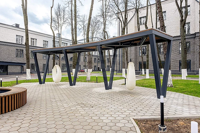 В кирпичном здании после полной реновации воссоздана атмосфера старинной усадьбы. На огороженной территории находится красивый парк с высокими вечнозелеными деревьями. Здесь оборудованы зоны отдыха и детская площадка, где вы и ваши гости сможете комфортно проводить время. Также есть парковка, а внутри здания предусмотрено место для хранения колясок и детского транспорта.