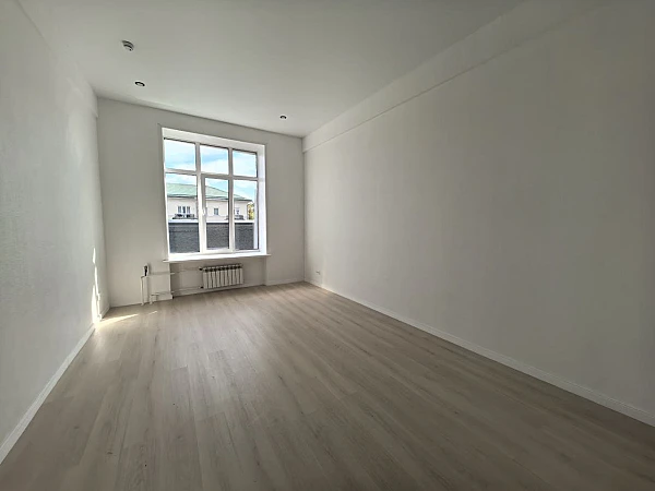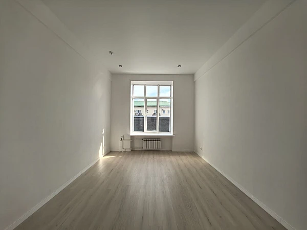 На стенах поклеены обои под покраску, на полу постелен ламинат с плинтусами и откосами. Есть вытяжная вентиляция в санузле и на кухне, выходы хв/гв, место под раковину на кухне. Кроме того, в помещениях уже есть выключатели освещения, розетки для бытовой техники и роутера, а также сделаны закладные для оптоволокна для интернета.