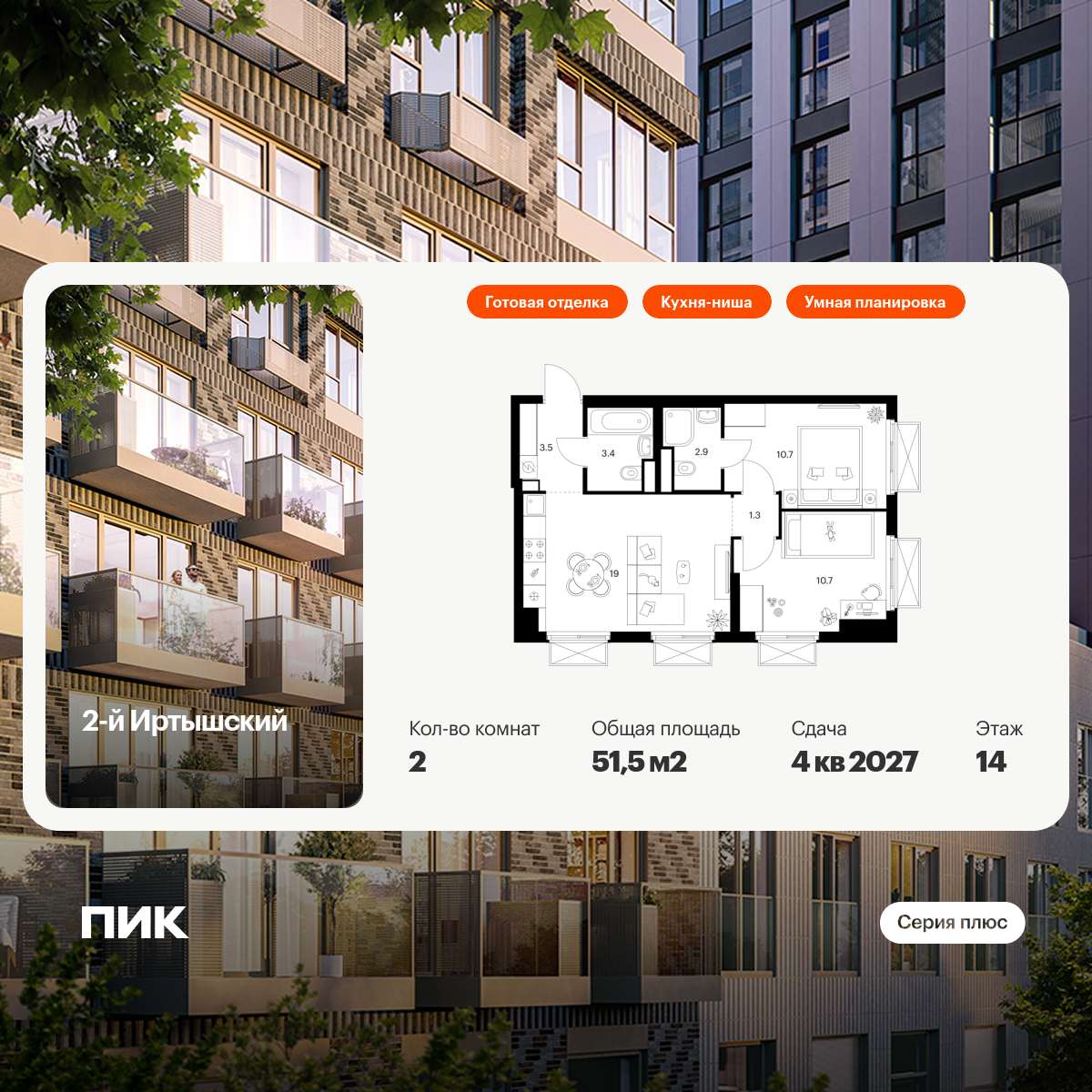 Продаётся 2-комн.квартира площадью 51.50 кв.м на 14 этаже 20 этажного дома (Корпус 1.7, секция 7) проекта ПИК 2-й Иртышский. Светлый просторный подъезд на уровне земли, функциональная планировка, большие окна, с отделкой.