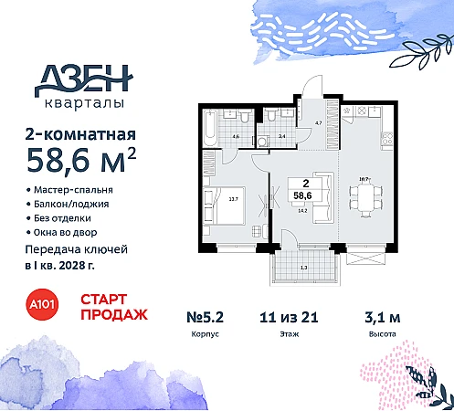 Продается 2-комн. квартира бизнес-класса с европланировкой в ЖК "Дзен-кварталы" на 11 этаже. Квартира без отделки, новый владелец может сделать ремонт по индивидуальному дизайн-проекту. Общая площадь: 58.6 кв.м., жилая: 27.9 кв.м., общая площадь гостиной-столовой с кухонной зоной: 30.9 кв.м. Европланировка, в просторной кухне-гостиной удобно как готовить, так и отдыхать. Комнаты изолированные, все окна выходят на одну сторону. В квартире один балкон, один совмещенный и один раздельный санузел. Высота потолков 3.1 м.