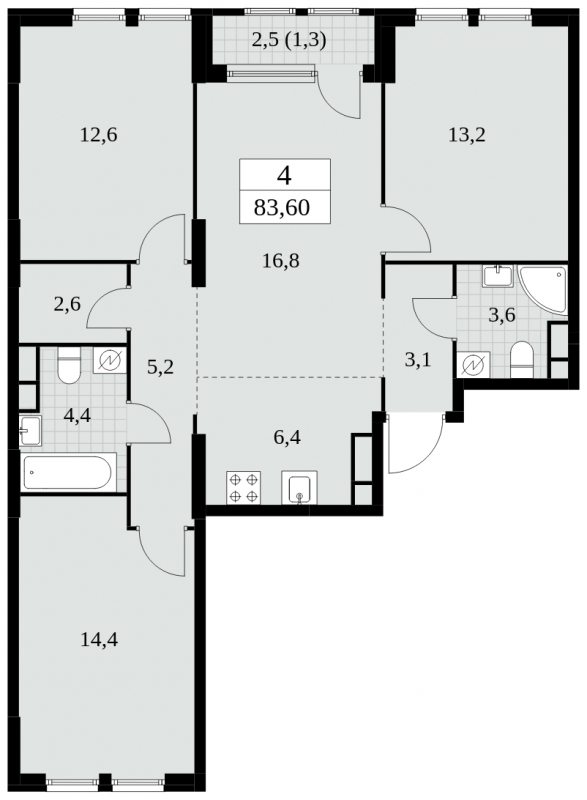 Четырехкомнатная квартира с европланировкой в ЖК "Южные сады" на 5 этаже. Квартира без отделки, после выдачи ключей можно делать ремонт. Общая площадь: 83.6 кв.м., жилая: 57 кв.м., общая площадь гостиной-столовой с кухонной зоной: 23.2 кв.м. Европейская планировка, зона гостиной комнаты объединена с кухней. Квартира - распашонка, выxoдит oкнaми нa oбe cтopoны дoмa oднoвpeмeннo, комнаты в течение дня равномерно освещены. В квартире одна лоджия, два совмещенных санузла. Высота потолков 2.87 м.