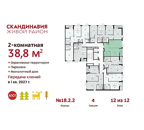 Дом монолитный, двухподъездный, высотой 12 этажей. Квартира находится во 2-й секции в корпусе 2.18.2.2. На этаже 7 квартир. В подъезде 1 пассажирский и 1 грузовой лифт. Начало строительства - 1 квартал 2024 года. Окончание строительства - 1 квартал 2027 года. Оформление сделки по договору долевого участия.