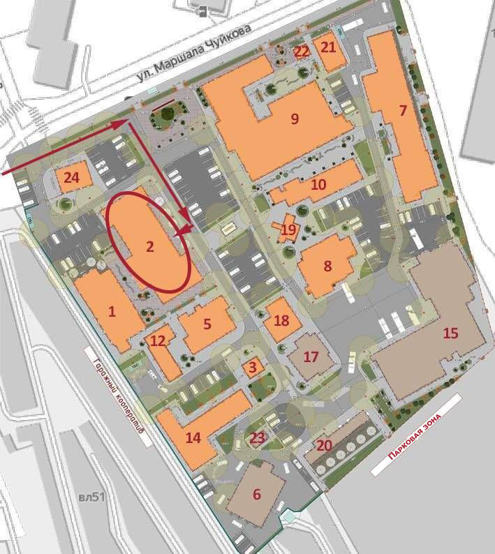 Нежилое помещение расположено в корпусе №2, вход со стороны центральной парковки бизнес-парка.