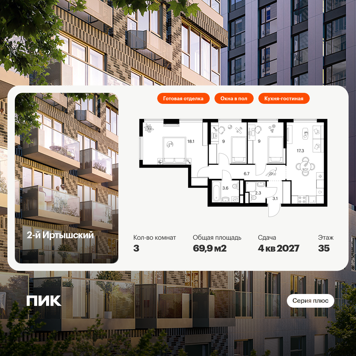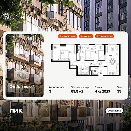 Продаётся 3-комн.квартира площадью 69.90 кв.м на 35 этаже 43 этажного дома (Корпус 1.1, секция 1) проекта ПИК 2-й Иртышский. Светлый просторный подъезд на уровне земли, функциональная планировка, большие окна, с отделкой.