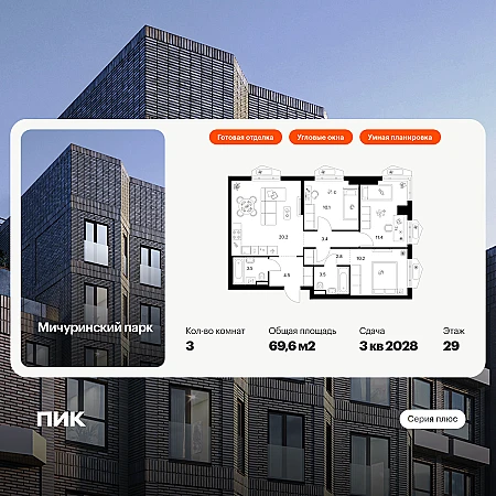 Купить 3к квартиру 69 м² в ЖК Мичуринский парк