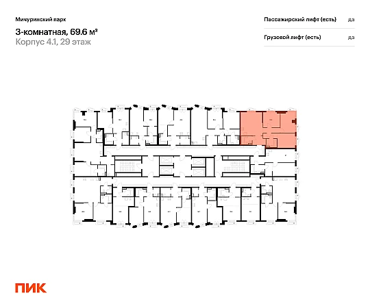 Продаётся 3-комн.квартира площадью 69.60 кв.м на 29 этаже 32 этажного дома (Корпус 4.1, секция 1) проекта ПИК Мичуринский парк. Светлый просторный подъезд на уровне земли, функциональная планировка, большие окна, с отделкой.