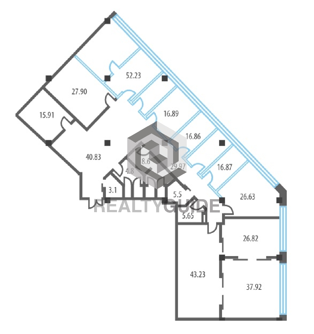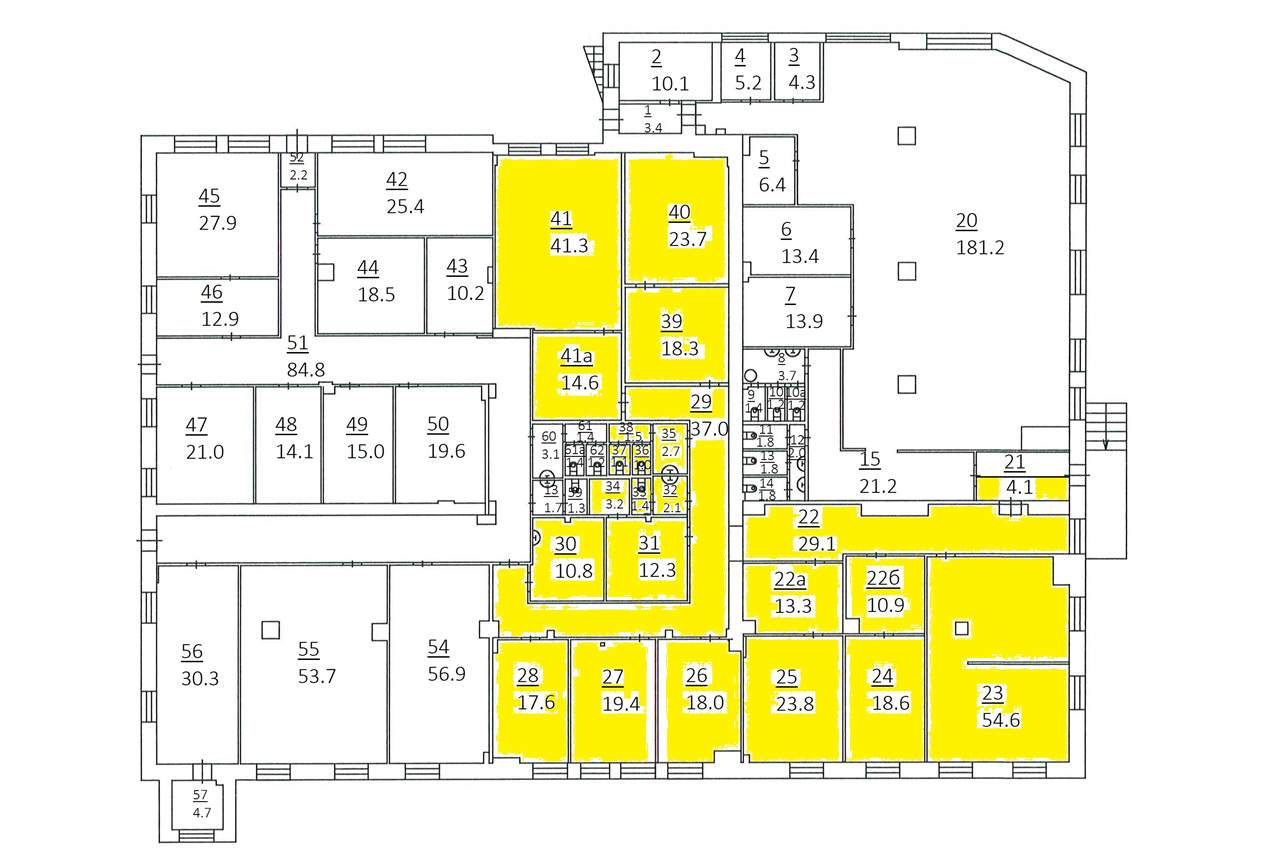 Офисный блок с отдельным входом. Помещение разбито на несколько кабинетов (54,6 кв.м. , 41,3 кв.м. , 23,8 кв.м. , 19,4 кв.м. , 17,6 кв.м. , 18,3 кв.м. , 14,6 кв.м. , 13,4 кв.м. , 10,9 кв.м. , складские помещения (23,7 + 12,3 кв.м. ) , серверная, кухня 10,8 кв.м. , а так же 3 с/у.