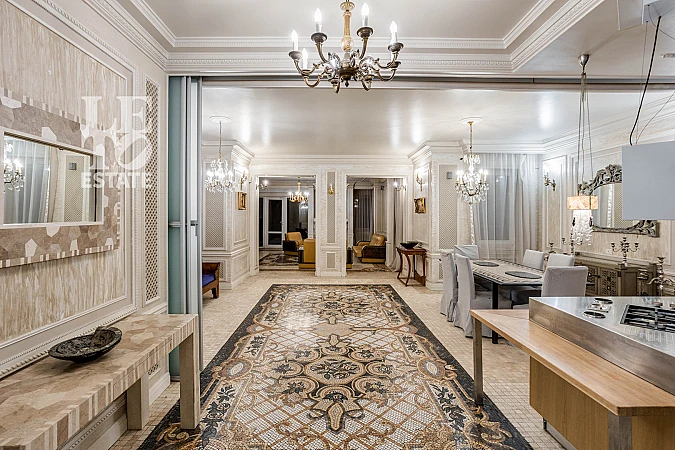 Первый этаж: холл, гостиная с камином, две кухни, гардеробная, два санузла, турецкая баня;