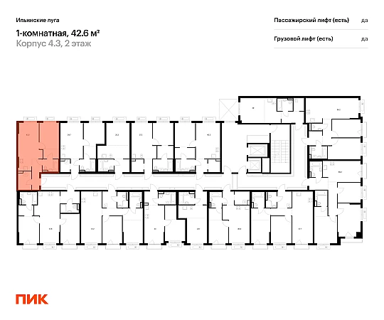 Продаётся 1-комн.квартира площадью 42.60 кв.м на 2 этаже 9 этажного дома (Корпус 4.3, секция 4) проекта ПИК Ильинские луга. Светлый просторный подъезд на уровне земли, функциональная планировка, большие окна, с отделкой.