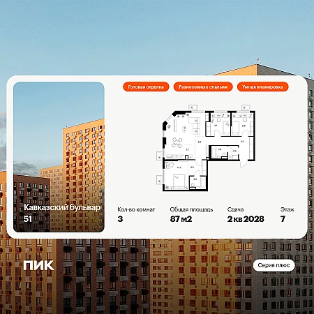 Продаётся 3-комн.квартира площадью 87.00 кв.м на 7 этаже 23 этажного дома (Корпус 3.3, секция 3) проекта ПИК Кавказский бульвар 51. Светлый просторный подъезд на уровне земли, функциональная планировка, большие окна, с отделкой.