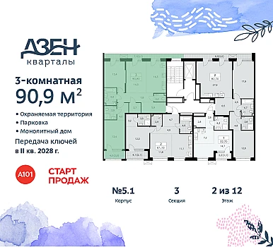 Продаётся 3-комн.квартира площадью 71.40 кв.м на 2 этаже 33 этажного дома (Корпус 2.7, секция 3) проекта ПИК Руставели 14. Светлый просторный подъезд на уровне земли, функциональная планировка, большие окна, с отделкой.