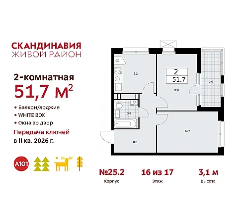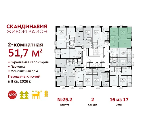Квартира находится в корпусе 2.25.2. Дом монолитный, одноподъездный, высотой 17 этажей. На этаже 10 квартир. В подъезде 1 пассажирский и 1 грузовой лифт. Начало строительства - 4 квартал 2023 года. Окончание строительства - 2 квартал 2026 года. Оформление сделки по договору долевого участия.
