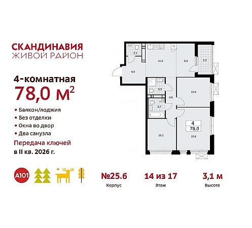 4-комн. квартира бизнес-класса с европланировкой от застройщика в ЖК "Скандинавия" на 14 этаже. Квартира без отделки, после оформления собственности можно делать ремонт. Общая площадь: 78 кв.м., жилая: 43.7 кв.м., суммарная площадь гостиной-столовой с кухонной зоной: 18.4 кв.м. Европейская планировка, зона гостиной комнаты объединена с кухней. Угловая квартира, очень светлая, естественная вентиляция при открытии окон. В квартире одна лоджия, два совмещенных и один раздельный санузел. Высота потолков 3.1 м.