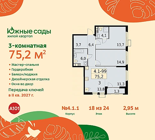 3-комн. квартира с европланировкой и отделкой в ЖК "Южные сады" на 18 этаже. Общая площадь: 75.2 кв.м., жилая: 39.9 кв.м., общая площадь гостиной-столовой с кухонной зоной: 25.1 кв.м. Европланировка, кухня-гостиная - идеальный вариант для тех, кто любит часто принимать гостей. Квартира угловая, очень светлая, естественная вентиляция при открытии окон. В квартире одна лоджия, два совмещенных санузла. Высота потолков 2.95 м.