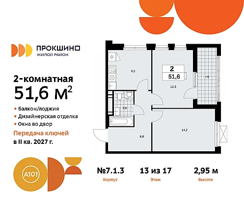 Продается двухкомнатная квартира от застройщика с отделкой в ЖК "Прокшино" на 13 этаже. Общая площадь: 51.6 кв.м., жилая: 26.7 кв.м., площадь просторной кухни-столовой: 9.2 кв.м. Квартира угловая, идеально подойдет любителям тишины и панорамных видов. В квартире одна лоджия, один совмещенный санузел. Высота потолков 2.95 м.