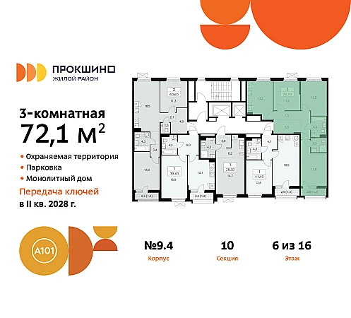 Дом монолитный, черырехподъездный, переменной этажности, от 10 до 16 этажей. Квартира находится в 3-й секции высотой 13 этажей в корпусе 9.4. На этаже 5 квартир. В подъезде 1 пассажирский и 1 грузовой лифт. Начало строительства - 3 квартал 2025 года. Окончание строительства - 4 квартал 2027 года. Оформление сделки по договору долевого участия.