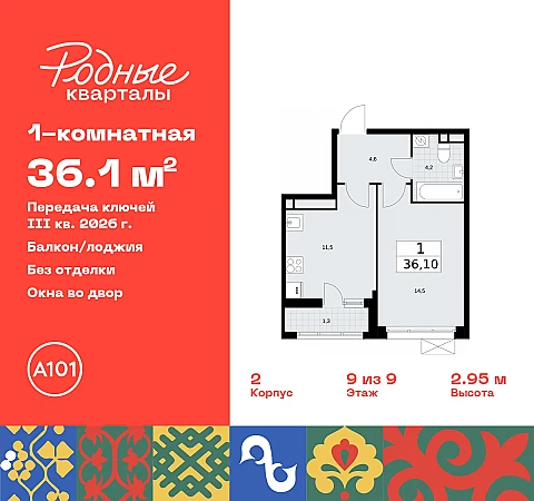 1-комн. квартира в ЖК "Родные кварталы" на 9 этаже. Квартира без отделки, после получения ключей можно делать ремонт. Общая площадь: 36.1 кв.м., жилая: 14.5 кв.м., площадь просторной кухни-столовой: 11.5 кв.м. Все окна выходят на одну сторону. В квартире одна лоджия, один совмещенный санузел. Высота потолков 2.9 м.