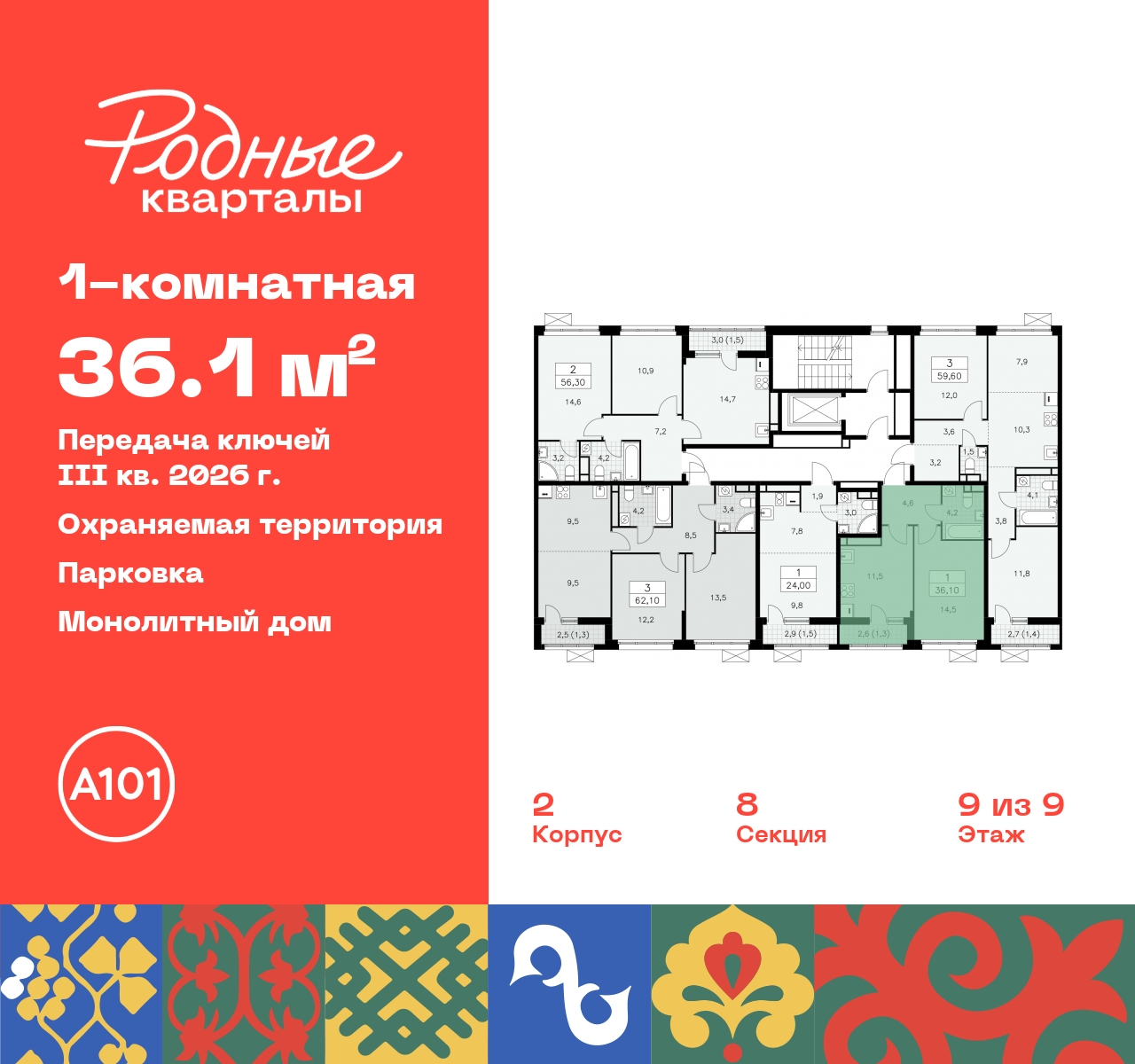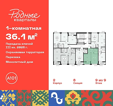 Купить 1к квартиру 36 м² в ЖК "Родные кварталы"