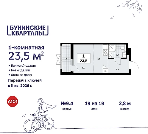 Однокомнатная квартира-студия от застройщика в ЖК "Бунинские кварталы" на 19 этаже. Квартира без отделки, полностью готова к чистовой отделке и дальнейшему ремонту. Общая площадь: 23.5 кв.м., площадь гостиной 13.9 кв.м., из которых 5.8 кв.м. выделено под кухонную зону. Все окна выходят на одну сторону. В квартире один балкон, один совмещенный санузел. Высота потолков 2.8 м.