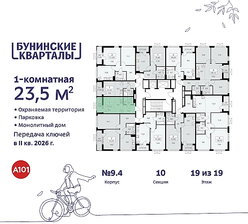 Квартира находится в корпусе 9.4. Дом монолитный, одноподъездный, высотой 19 этажей. На этаже 10 квартир. В подъезде 1 пассажирский и 1 грузовой лифт. Начало строительства - 4 квартал 2023 года. Окончание строительства - 2 квартал 2026 года. Оформление сделки по договору долевого участия.
