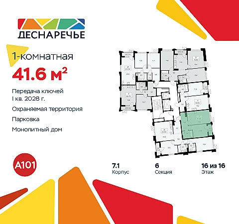 Дом монолитный, многоподъездный, переменной этажности, от 8 до 16 этажей. Квартира находится в 6-й секции высотой 16 этажей в корпусе 7.1. На этаже 6 квартир. В подъезде 1 пассажирский и 1 грузовой лифт. Начало строительства - 2 квартал 2025 года. Окончание строительства - 1 квартал 2028 года. Оформление сделки по договору долевого участия.