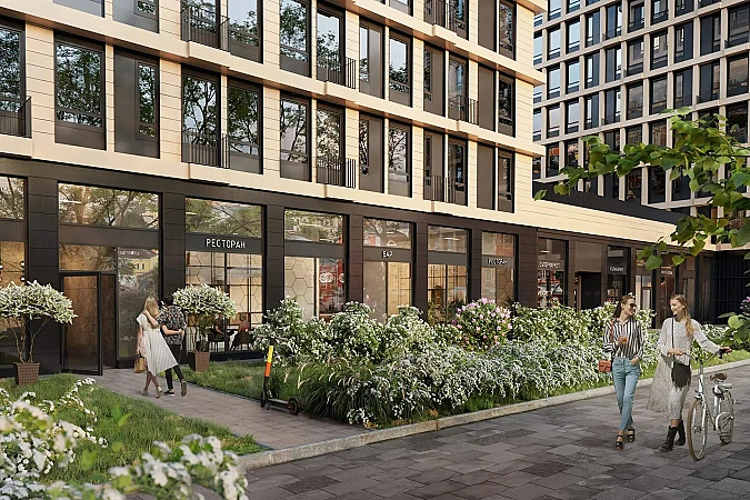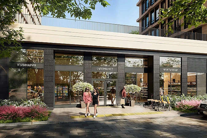 На первых этажах комплекса представлены коммерческие помещения площадью от 26 до 302 кв. м. Каждое помещение имеет отдельный вход, витринное остекление и возможность гибкой планировки. Здесь можно открыть супермаркет, кафе, офис, магазин или предприятие сферы услуг. Высокий пешеходный трафик обеспечивается благодаря близости жилого комплекса и будущего крупного общественно-делового квартала.
