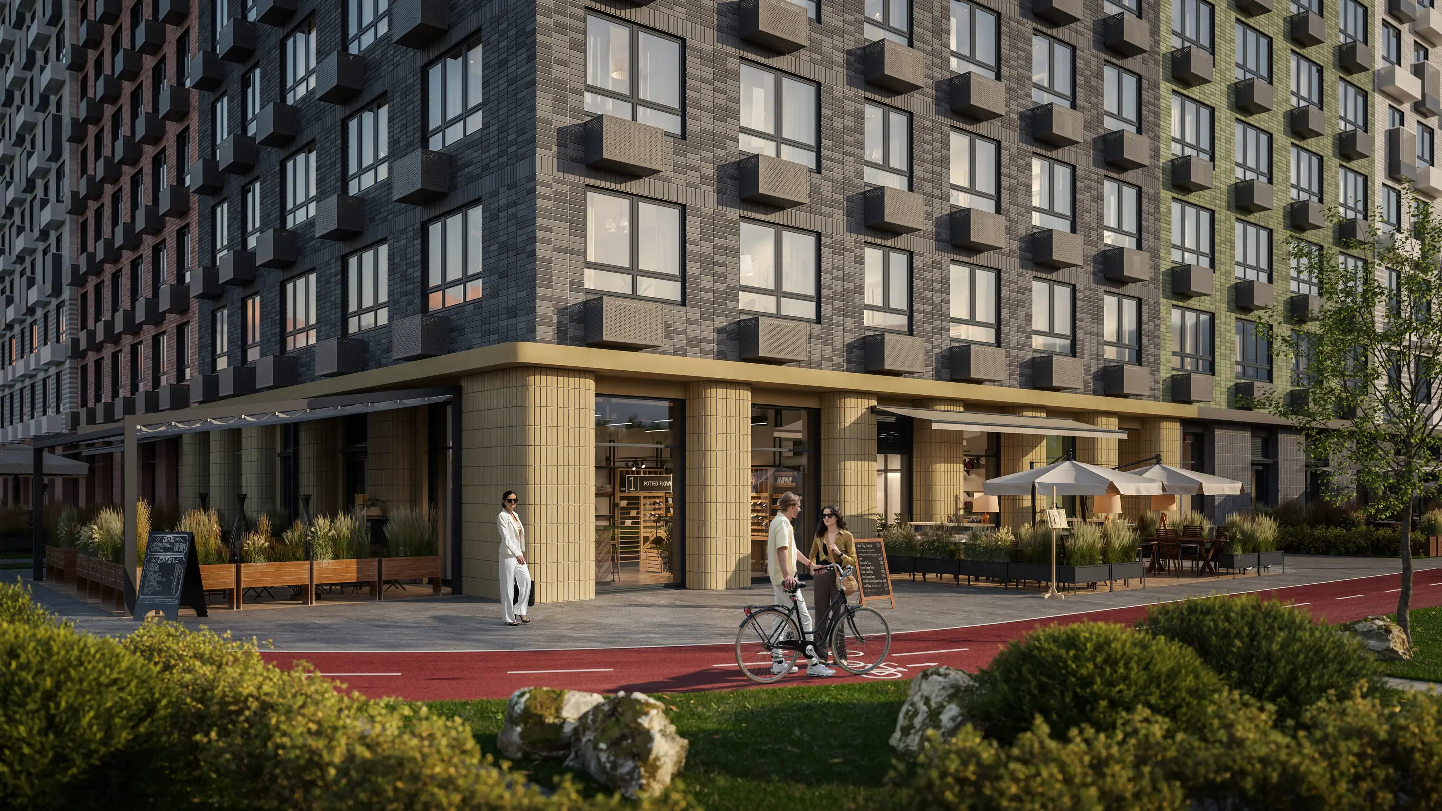 - Спортивная среда: закольцованный веломаршрут с навигацией, спортивный комплекс с термами, закрытый тренажерный зал и зоны ворк-аута