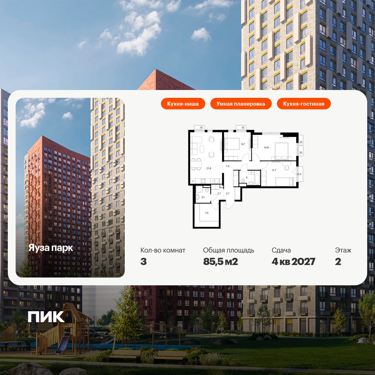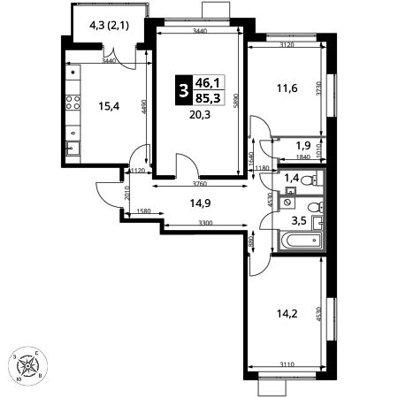 Продаётся 3-к квартира номер 421 общей площадью 85.4 кв.м. на 11-м этаже 14 этажного здания. Отделка Whitebox. Цена с учётом скидки.