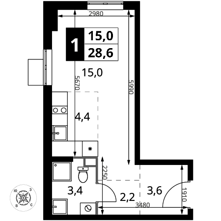 Продаётся квартира-студия номер 44 общей площадью 28.6 кв.м. на 9-м этаже 16 этажного здания. Без отделки.