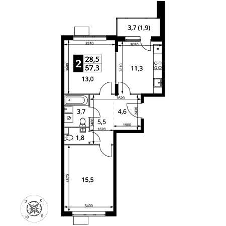 Продаётся 2-к квартира номер 1109 общей площадью 57.3 кв.м. на 17-м этаже 17 этажного здания. Без отделки.