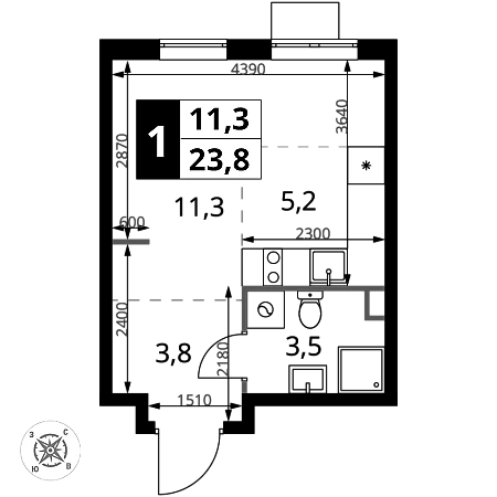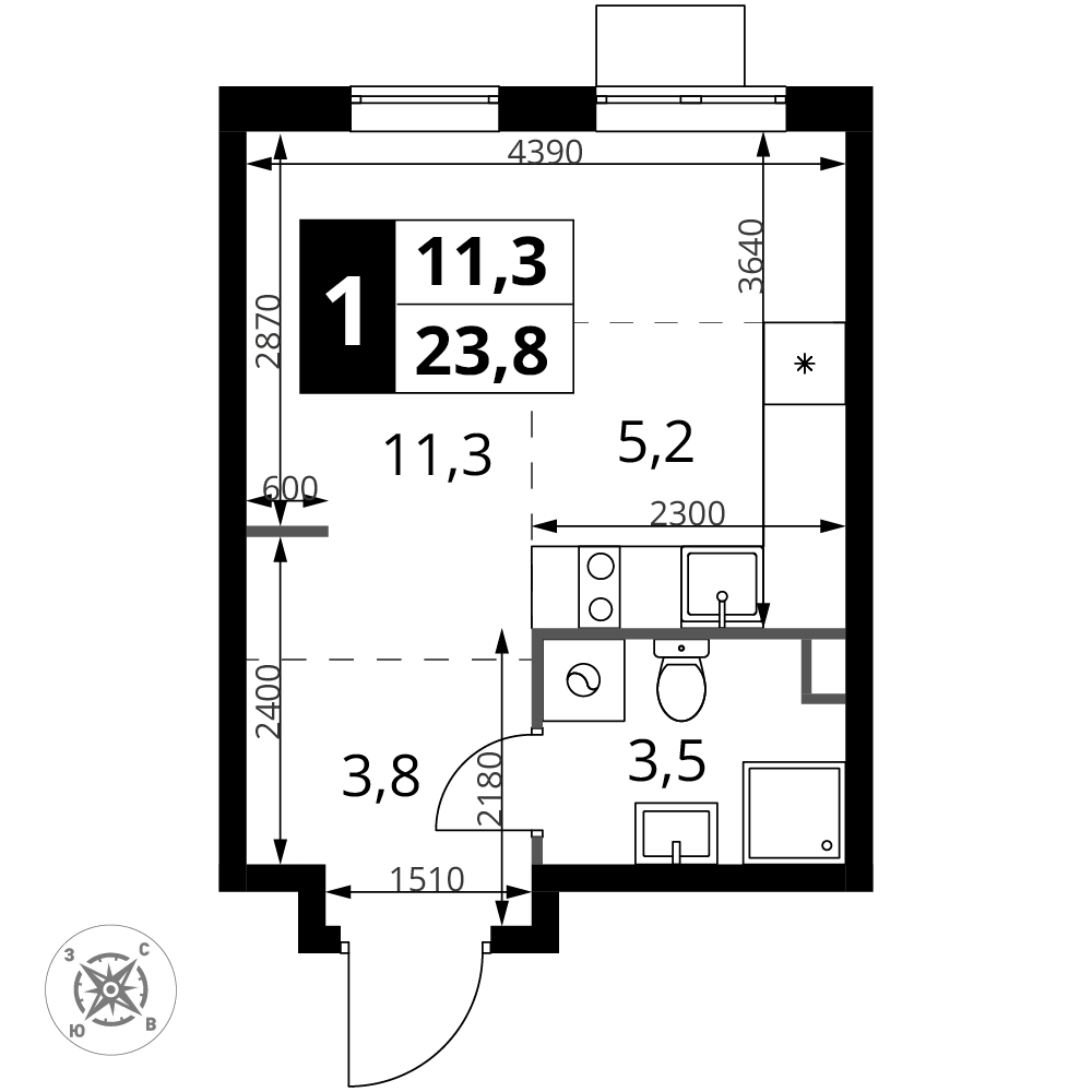 Продаётся квартира-студия номер 1184 общей площадью 23.8 кв.м. на 2-м этаже 17 этажного здания. Без отделки.