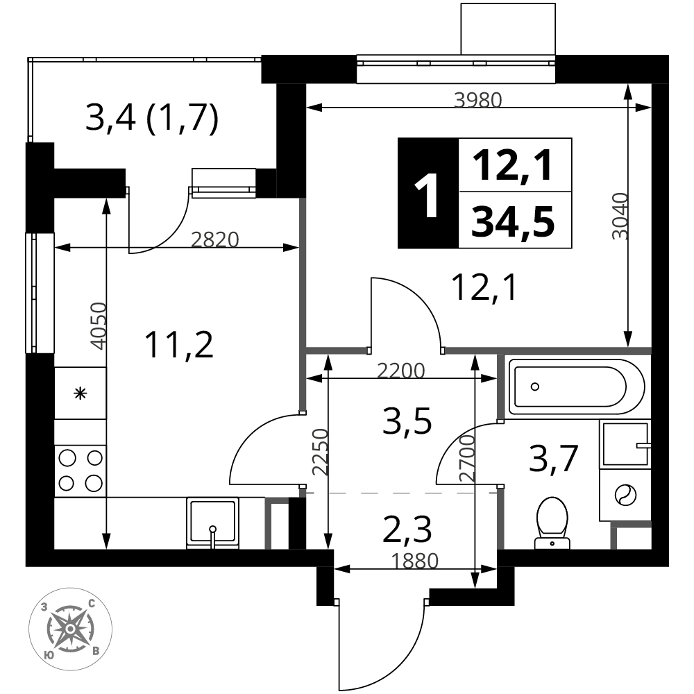 Продаётся 1-к квартира номер 1289 общей площадью 34.5 кв.м. на 11-м этаже 17 этажного здания. Без отделки.