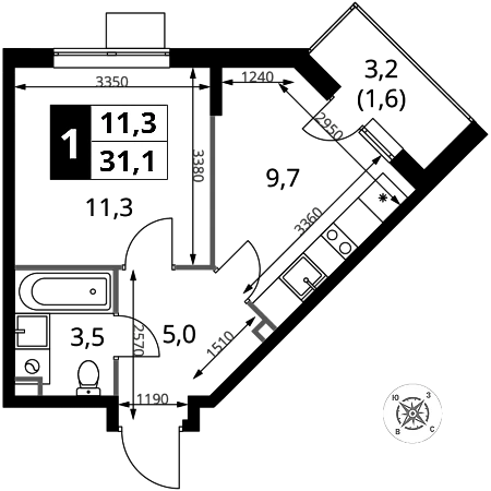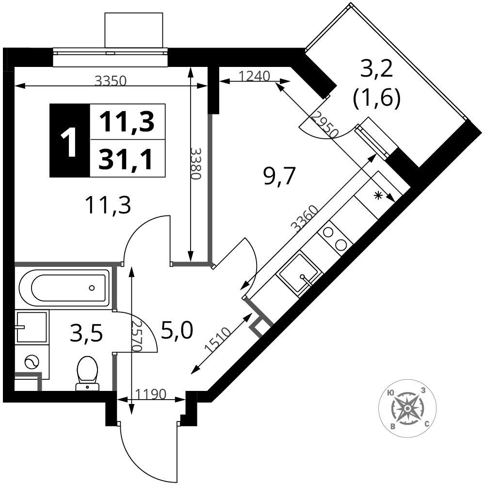 Продаётся 1-к квартира номер 128 общей площадью 31.1 кв.м. на 9-м этаже 16 этажного здания. Отделка Whitebox.