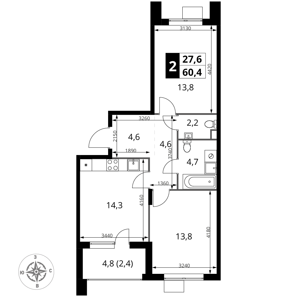 Продаётся 2-к квартира номер 213 общей площадью 60.4 кв.м. на 13-м этаже 16 этажного здания. Без отделки.