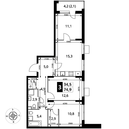 Продаётся 3-к квартира номер 473 общей площадью 74.9 кв.м. на 16-м этаже 17 этажного здания. Без отделки.