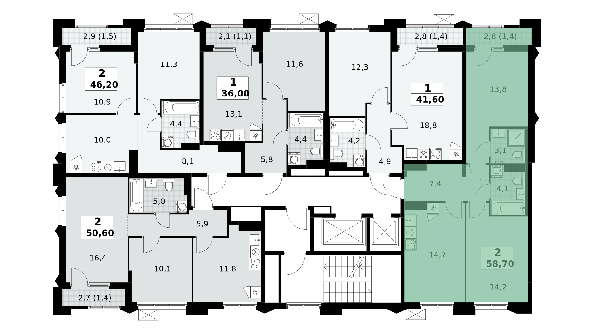 В ЖК 1-й Шереметьевский разнообразие площадей и планировок. Большие кухни-гостиные: в них два окна или больше. Во всех квартирах площадью от 40 кв.м. и выше спроектировано 2 санузла. Большие остекленные лоджии с отделкой.