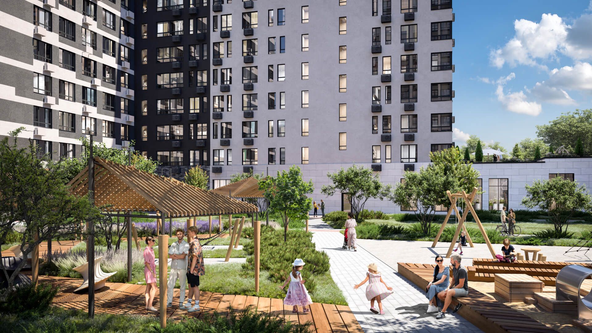 Дворы без машин. Безопасные детские площадки. Вдоль корпусов организованы зоны тихого отдыха: детский гомон с далеких каруселей и горок не достигнет окон жителей. В квартале спроектирован закольцованный веломаршрут с понятной навигацией и парковками для двухколесного транспорта.