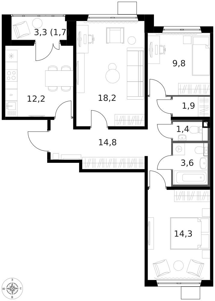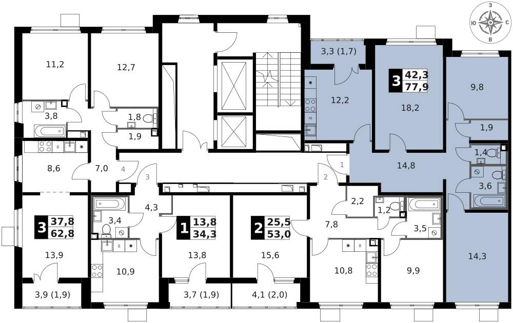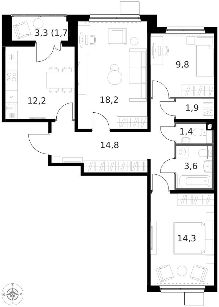 В ЖК 1-й Шереметьевский разнообразие площадей и планировок. Большие кухни-гостиные: в них два окна или больше. Во всех квартирах площадью от 40 кв.м. и выше спроектировано 2 санузла. Большие остекленные лоджии с отделкой.