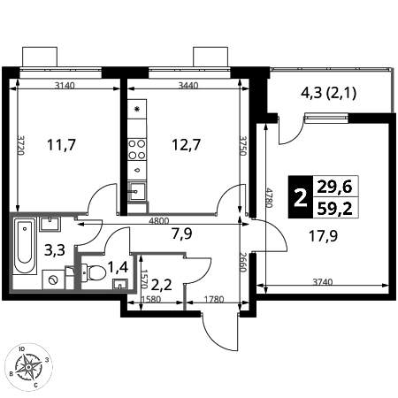 Продаётся 2-к квартира номер 178 общей площадью 59.1 кв.м. на 22-м этаже 25 этажного здания. Отделка Whitebox. Цена с учётом скидки.