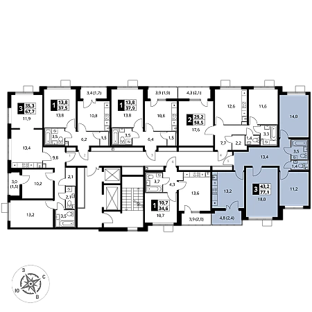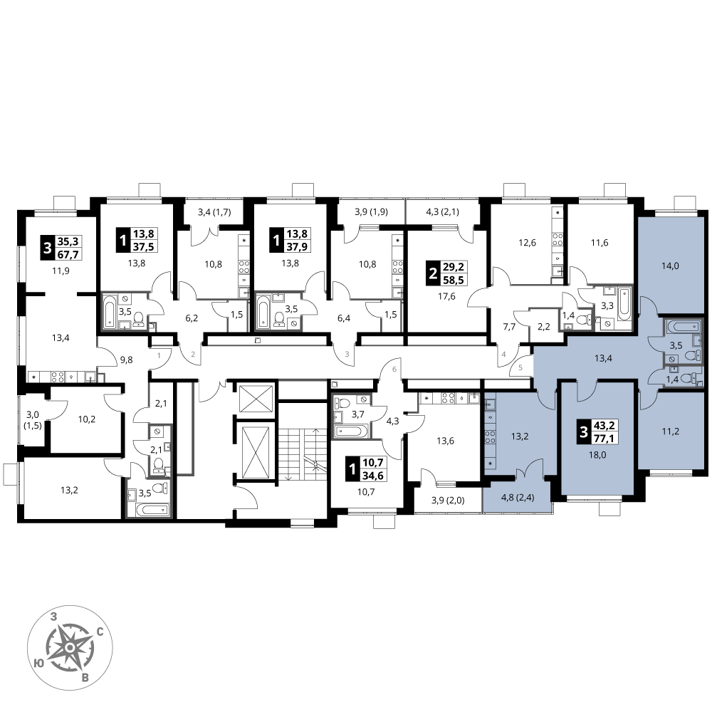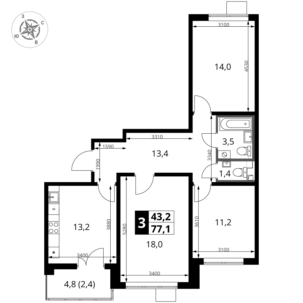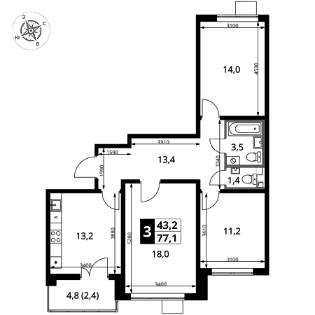 Продаётся 3-к квартира номер 97 общей площадью 77.1 кв.м. на 2-м этаже 24 этажного здания. Отделка Whitebox. Цена с учётом скидки.