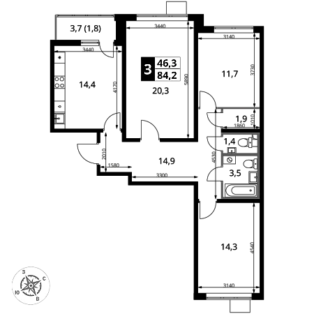 Продаётся 3-к квартира номер 594 общей площадью 84.2 кв.м. на 16-м этаже 25 этажного здания. Отделка Whitebox. Цена с учётом скидки.
