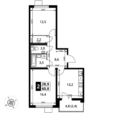Продаётся 2-к квартира номер 521 общей площадью 60.8 кв.м. на 5-м этаже 25 этажного здания. Отделка Whitebox. Цена с учётом скидки.
