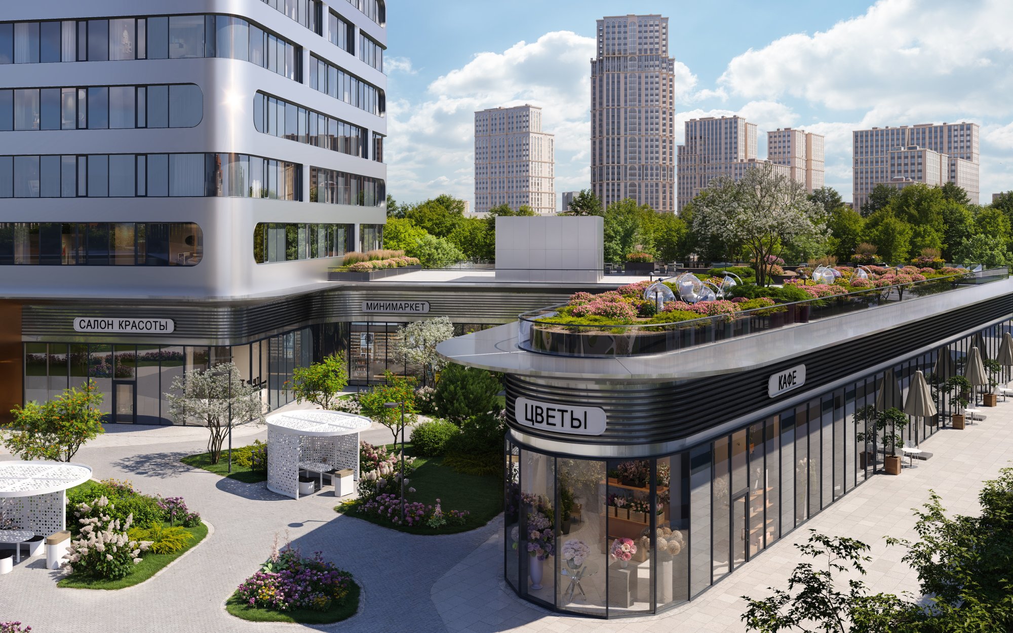 Дополнительные пространства для отдыха будут размещены в закрытых зеленых дворах на стилобате. Здесь будут расположены детские площадки с песочницами, тактильными дорожками, каруселями и природными игровыми элементами. Те, кто привык работать и отдыхать с комфортом, по достоинству оценят тишину зон отдыха, наличие удобных кресел и настила для йоги. В холодное время года будет приятно воспользоваться навесами, оснащенными подогревом и зарядными устройствами.
