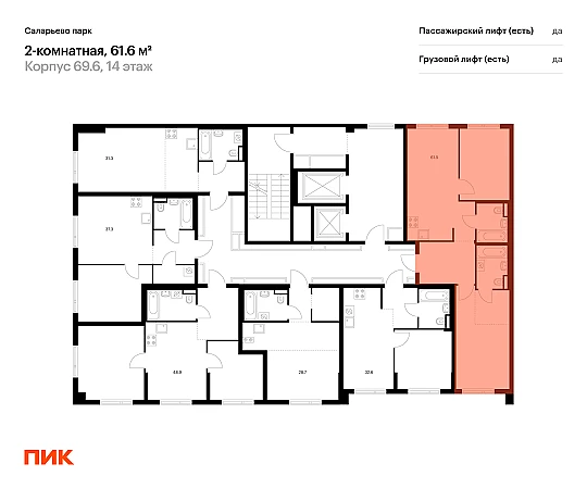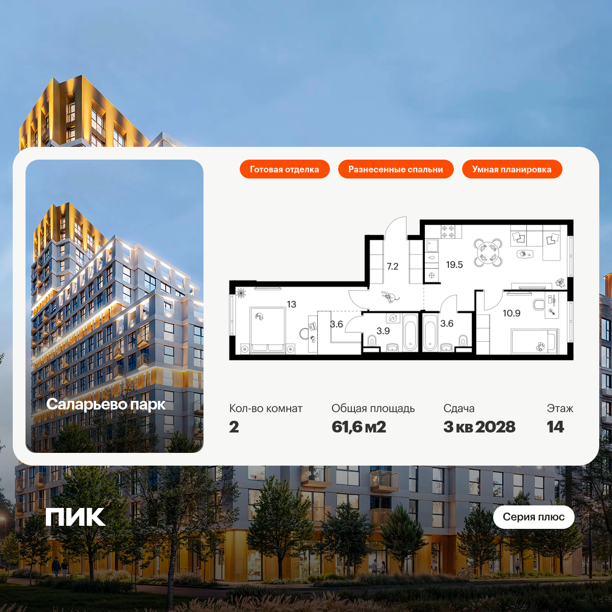 Продаётся 2-комн.квартира площадью 61.60 кв.м на 14 этаже 14 этажного дома (Корпус 69.6, секция 6) проекта ПИК Саларьево парк. Светлый просторный подъезд на уровне земли, функциональная планировка, большие окна, с отделкой.