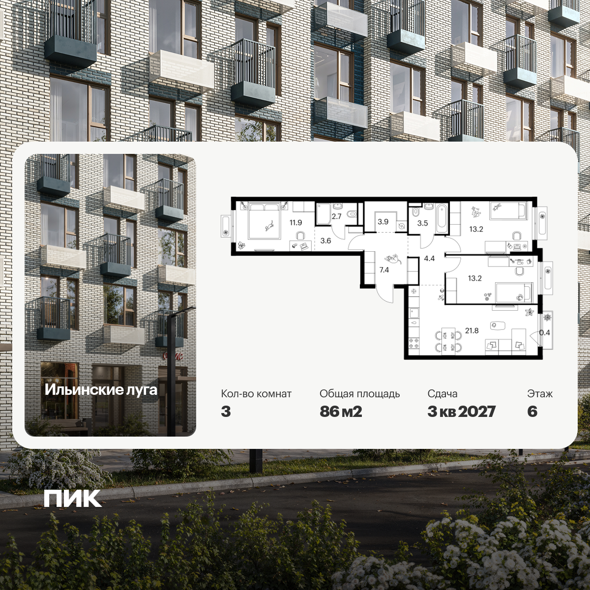 Купить 3к квартиру 68 м² в ЖК Зелёный Парк