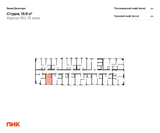 Продаётся квартира-студия площадью 18.90 кв.м на 15 этаже 25 этажного дома (Корпус 16.1, секция 1) проекта ПИК Белая Дача парк. Светлый просторный подъезд на уровне земли, функциональная планировка, большие окна, с отделкой.