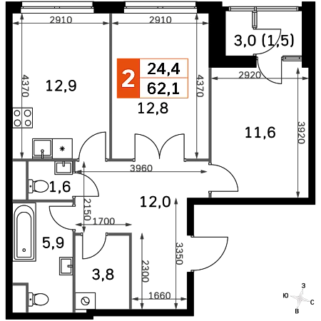 Продаётся 2-к квартира номер 824 общей площадью 62.1 кв.м. на 24-м этаже 43 этажного здания. Отделка Whitebox. Цена с учётом скидки.