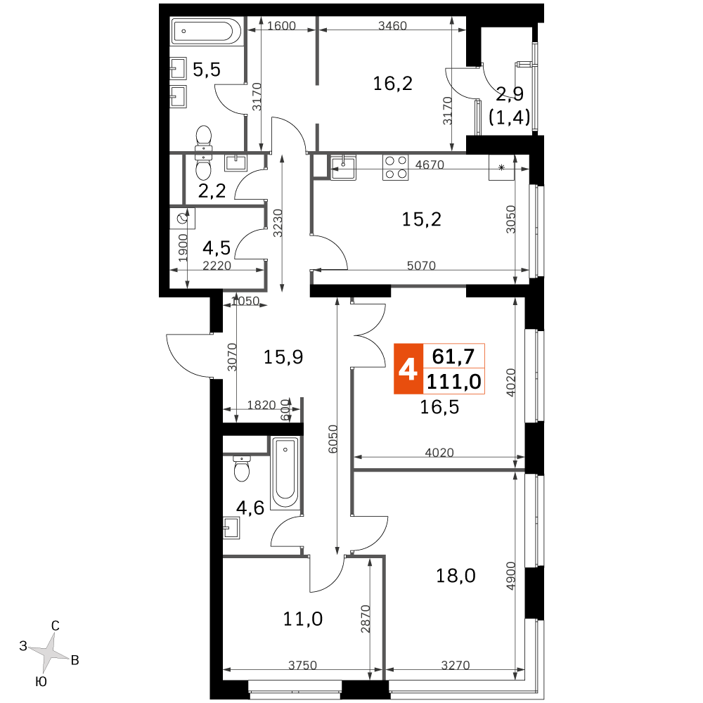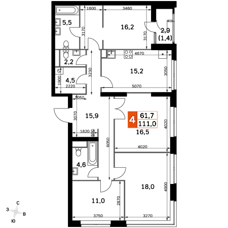 Продаётся 4-к квартира номер 1215 общей площадью 111 кв.м. на 4-м этаже 30 этажного здания. Отделка Whitebox. Цена с учётом скидки.