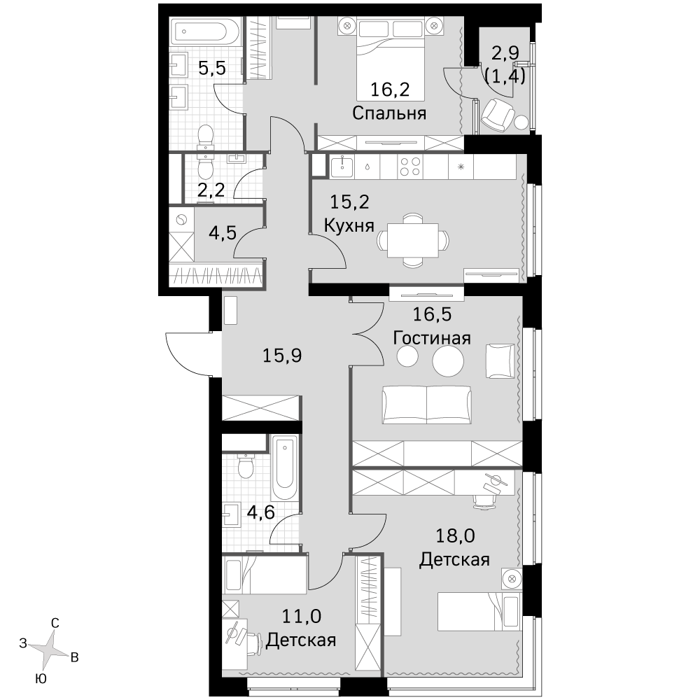 - Мастер-зона с санузлом и гардеробной. Всё для вашего комфорта и удобства, включая личный санузел и гардероб.